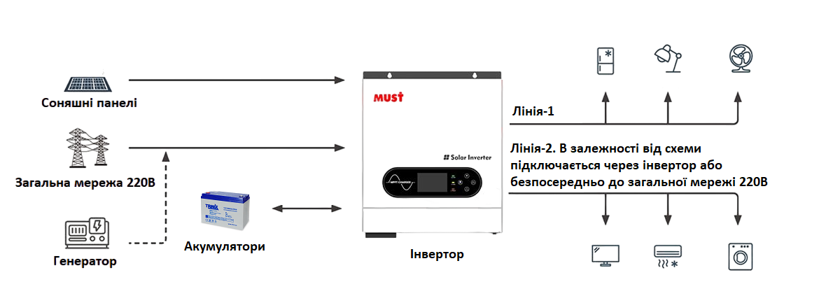 Перший - підключати на всі лінії, у такому випадку потрібно підбирати потужний інвертор, здатний витримати максимальні навантаження в момент наявності електроенергії.